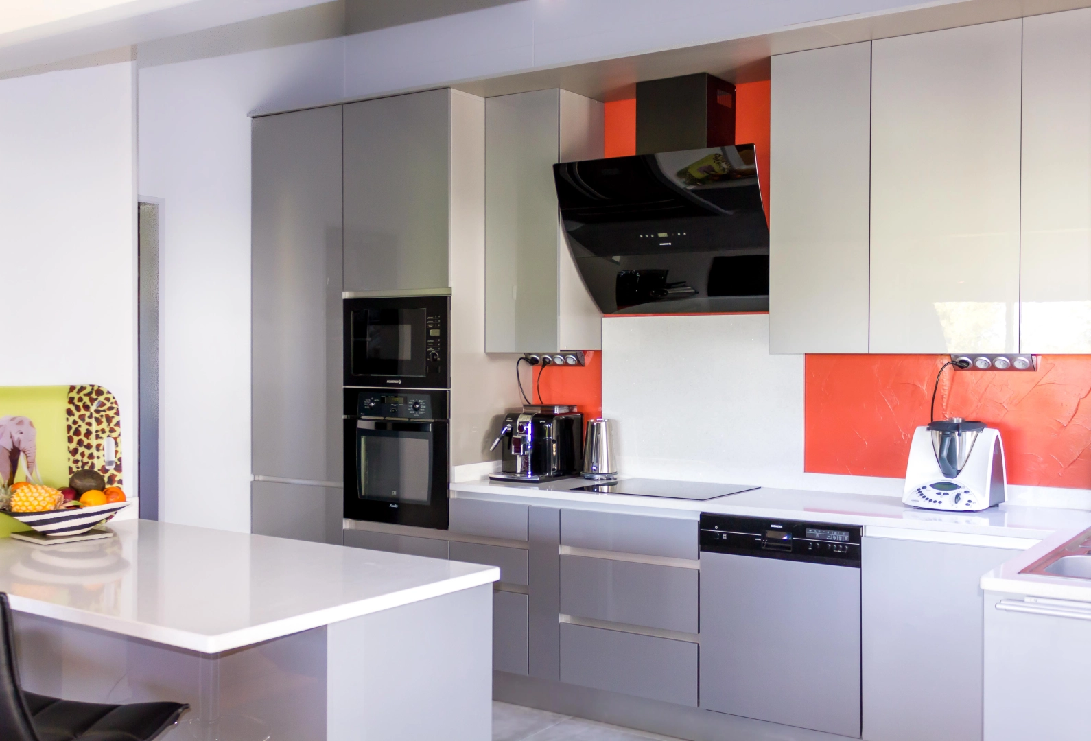 Agencement sur mesure..réalisé à partir d'idées du client .Études et réalisations par nos soins: Matériaux: panneaux de mdf de 18mm avec revêtement acrylique gris argent, particularité:dureté extrême,haute qualité. Fournisseur: Fibres industrie bois.