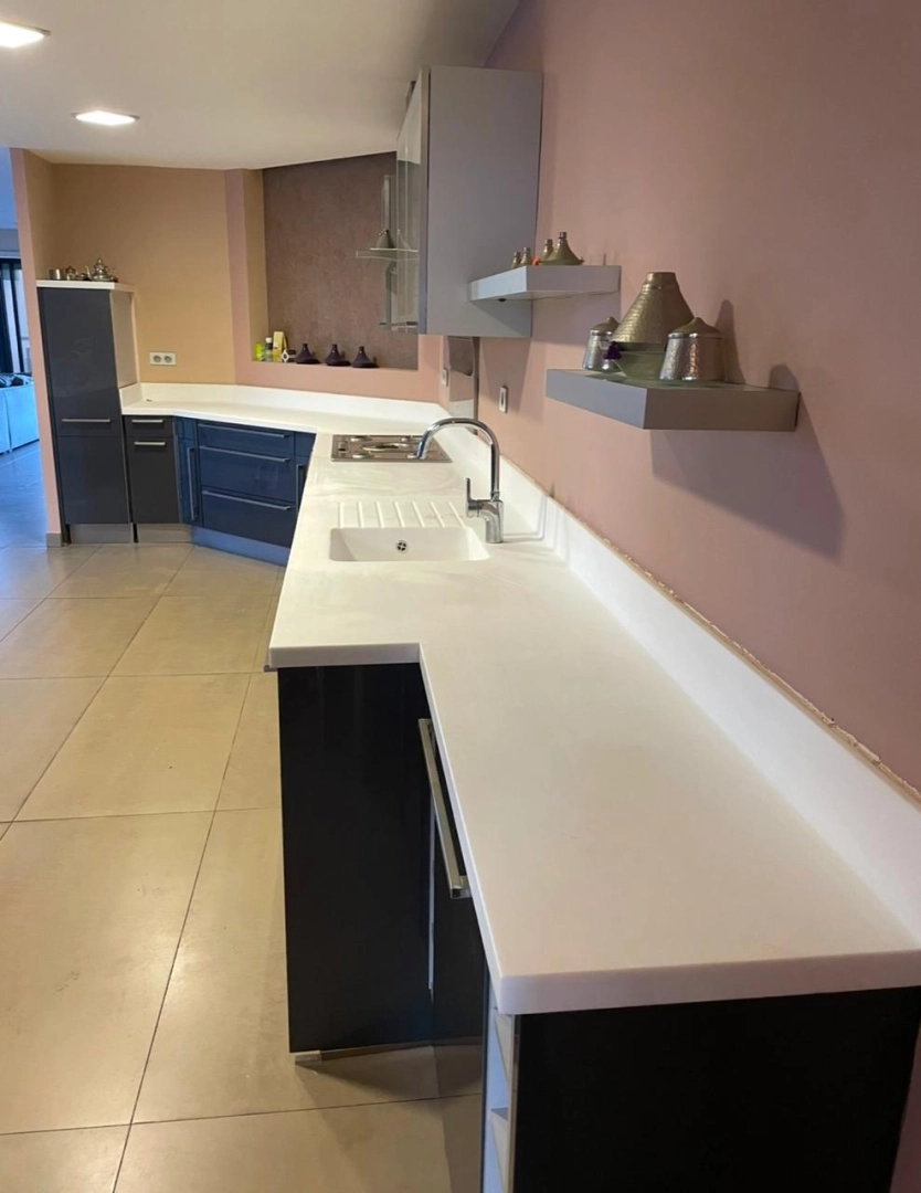Cuisine en plan de travail pierre acrylique ou traditionnelle.